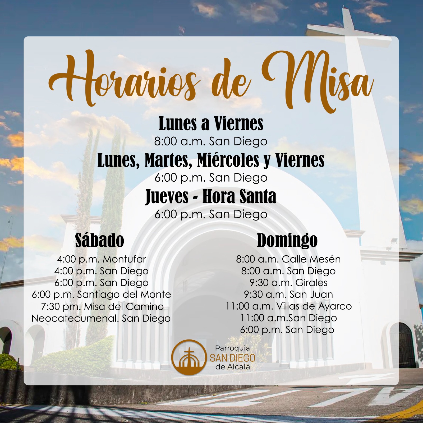 Sábado 6:00 pm y Hora Santa jueves a las 7:00 pm